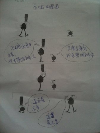 高個見到矮個,心想:ㄨY ㄌㄟ 怎麼這麼矮,誏他頭抬這麼高跟我講話有點不方便,我來想個辦法,看看能不能幫他。